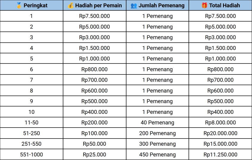 4. Setiap periode akan memiliki peringkat dan pemenang yang berbeda. Semua pemain akan mulai dari nol di awal pada setiap periode